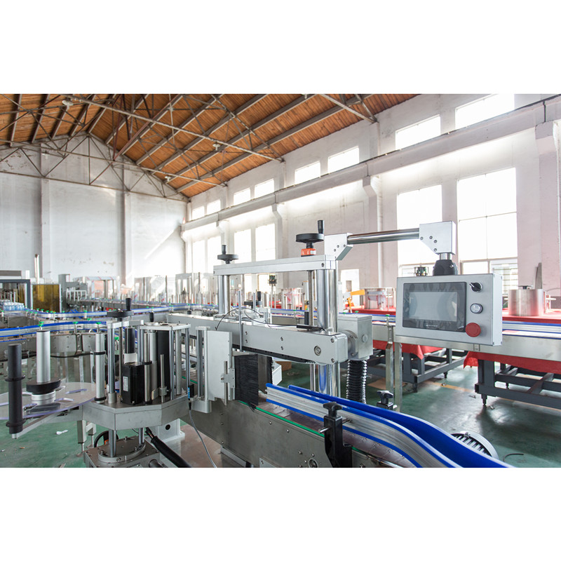 • 雙面貼標機由兩個貼標機頭組成;分別位于輸送板鏈兩側,扁瓶或方瓶雙側面貼標時,被貼物經由貼標機輸送帶進入,接著經過分瓶校正機械對待貼瓶進行分瓶使之保持一定的間距,接著待貼瓶再通進頂壓扶正機構將瓶子帶入貼標區域。進入貼標區域后,視物光纖檢測到瓶子,將光電信號傳輸到PLC,由PLC處理后將輸出信號傳輸到步進電機,由步進電機出標,標簽從剝離板上剝離出標并使標簽前端粘貼于被貼物表面,底紙回繞;通過撫標毛刷將標簽貼到瓶子上,測標電眼檢測到標簽間隙時,標簽按設置繼續向前伸出預出標長度,送標器步進(伺服)電機停轉,出標停止; 被貼物進入卷標裝置/撫標裝置,標簽被平經過海綿滾輪撫平標簽,貼好標簽后的物體由貼標機輸送帶進入下一流程。